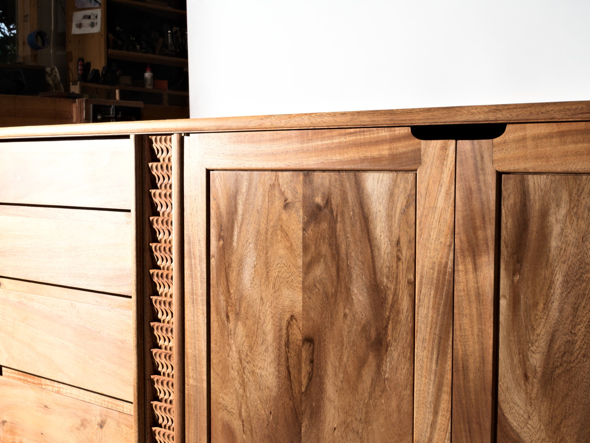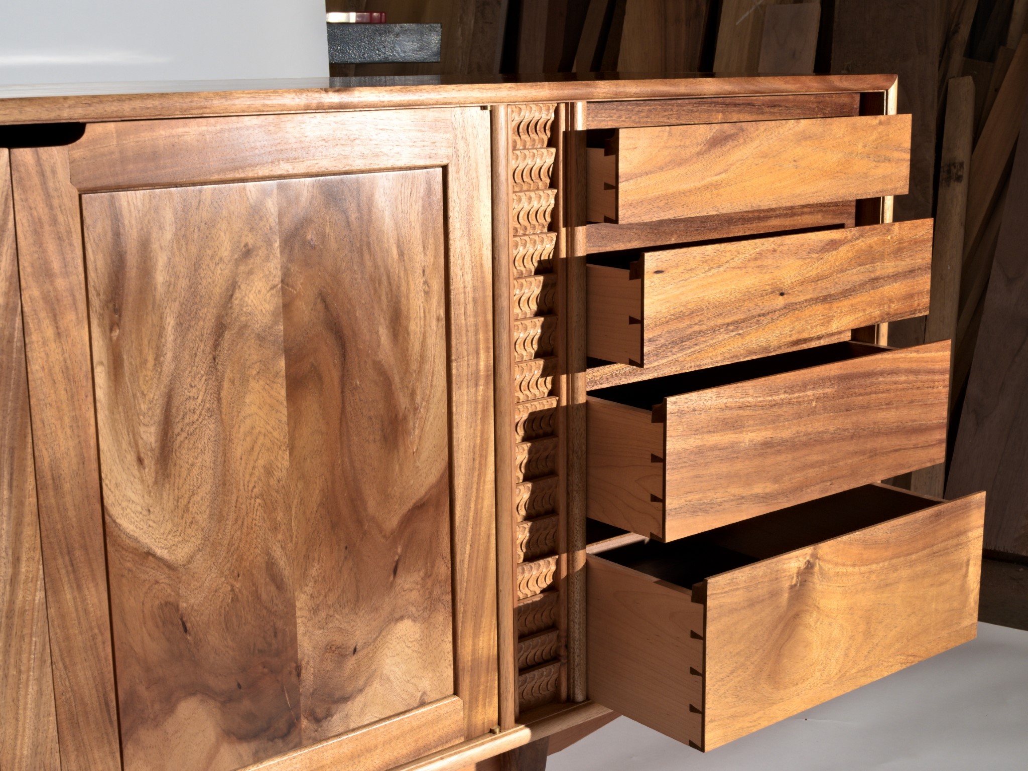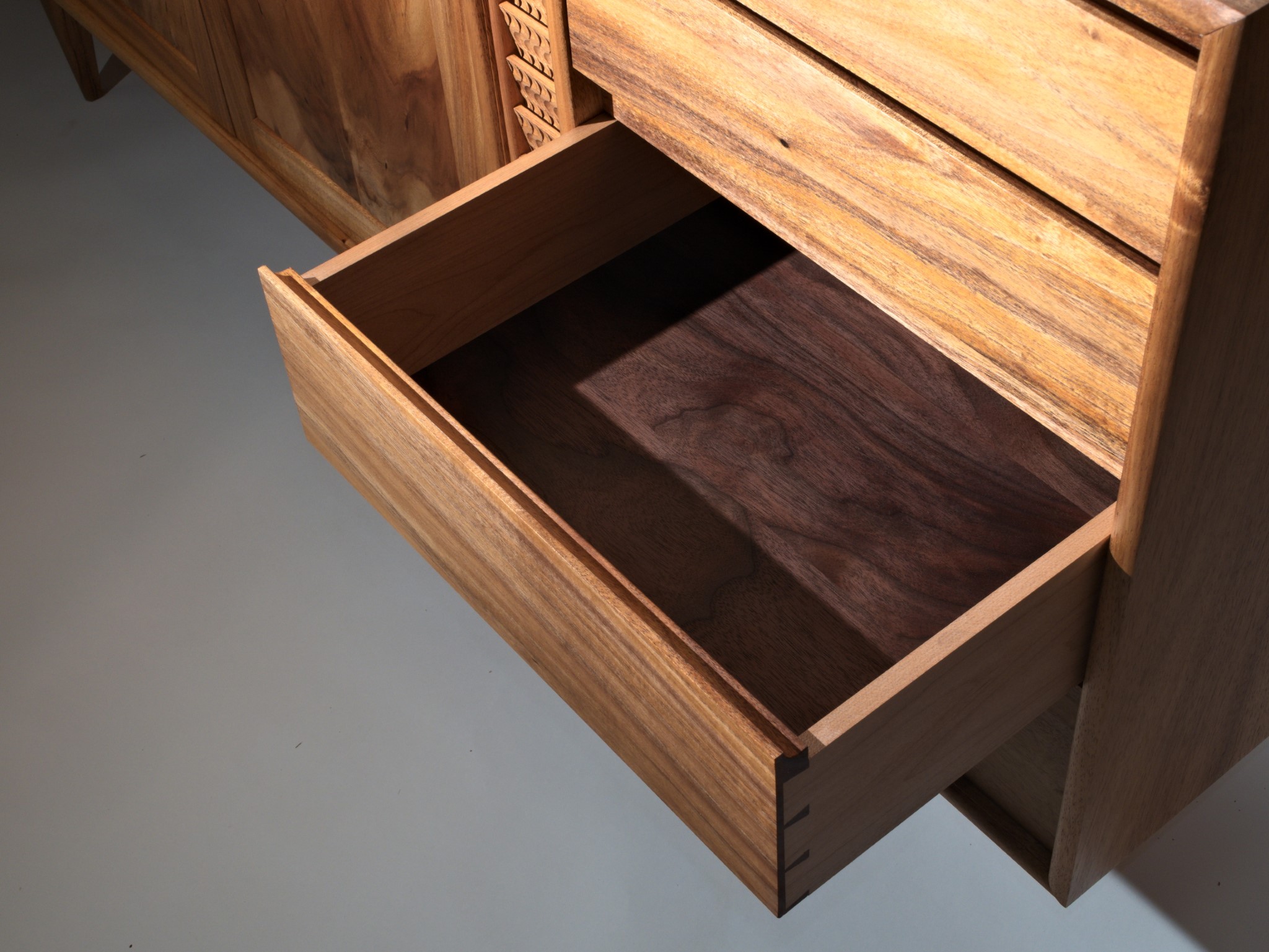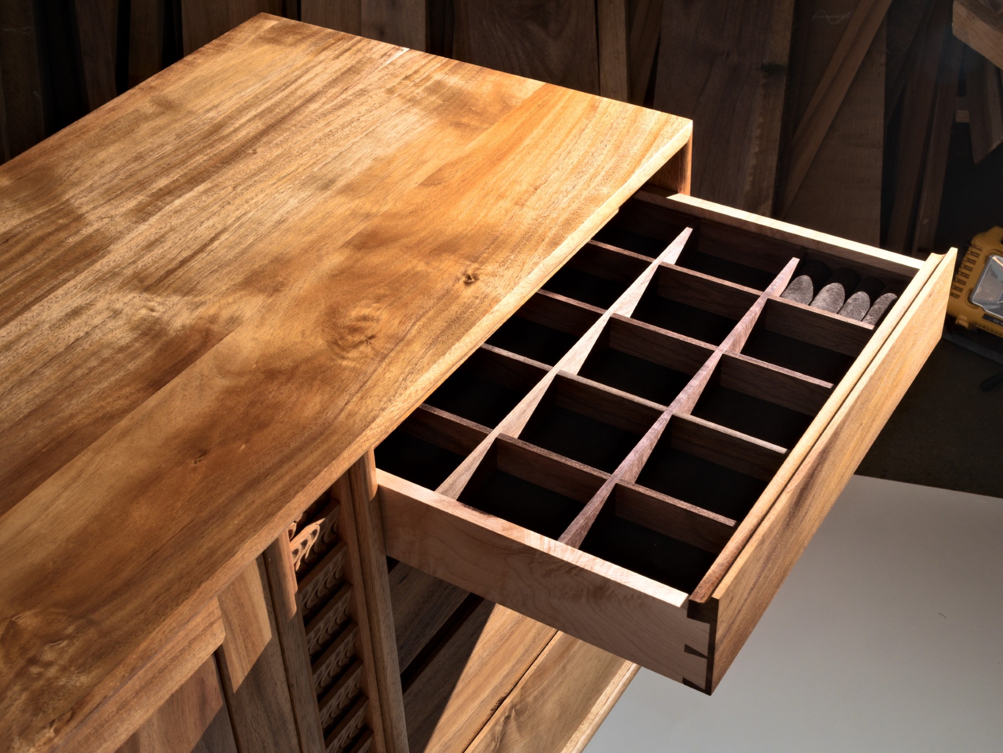The entire piece is built from solid timber, sourced locally, right here in Northland. This cabinet was designed to house my client’s earring collection, with the top drawers lined in the finest pig suede.