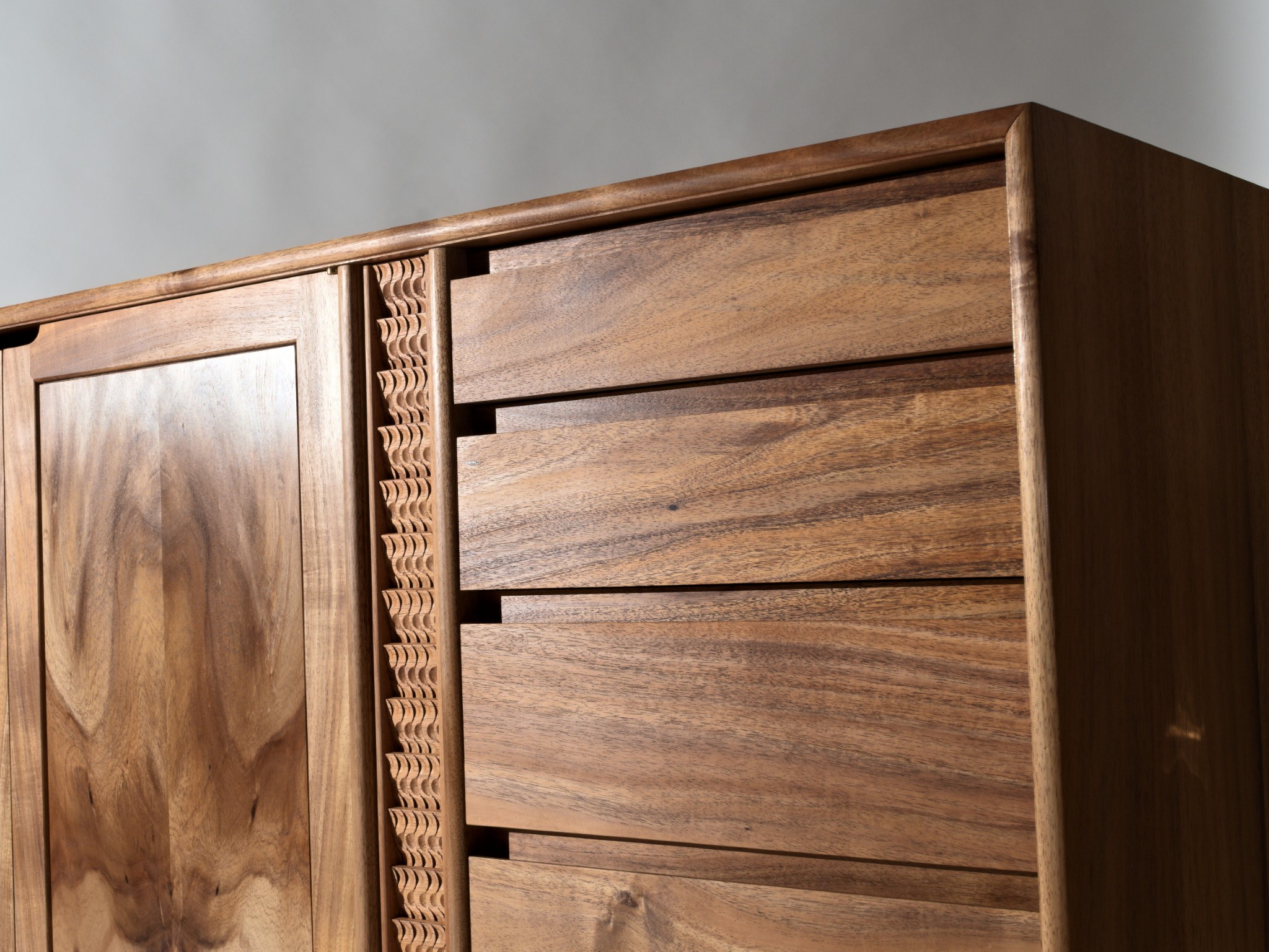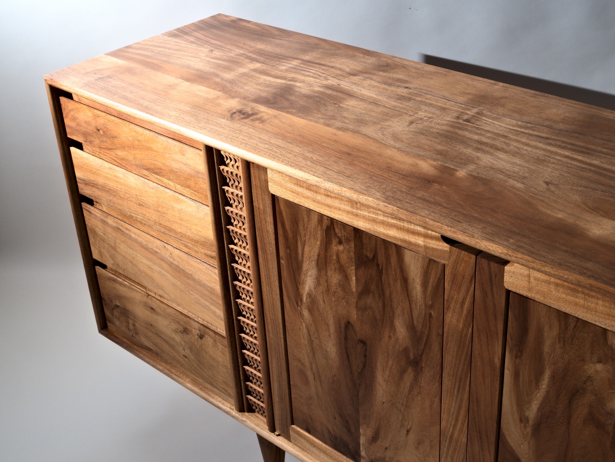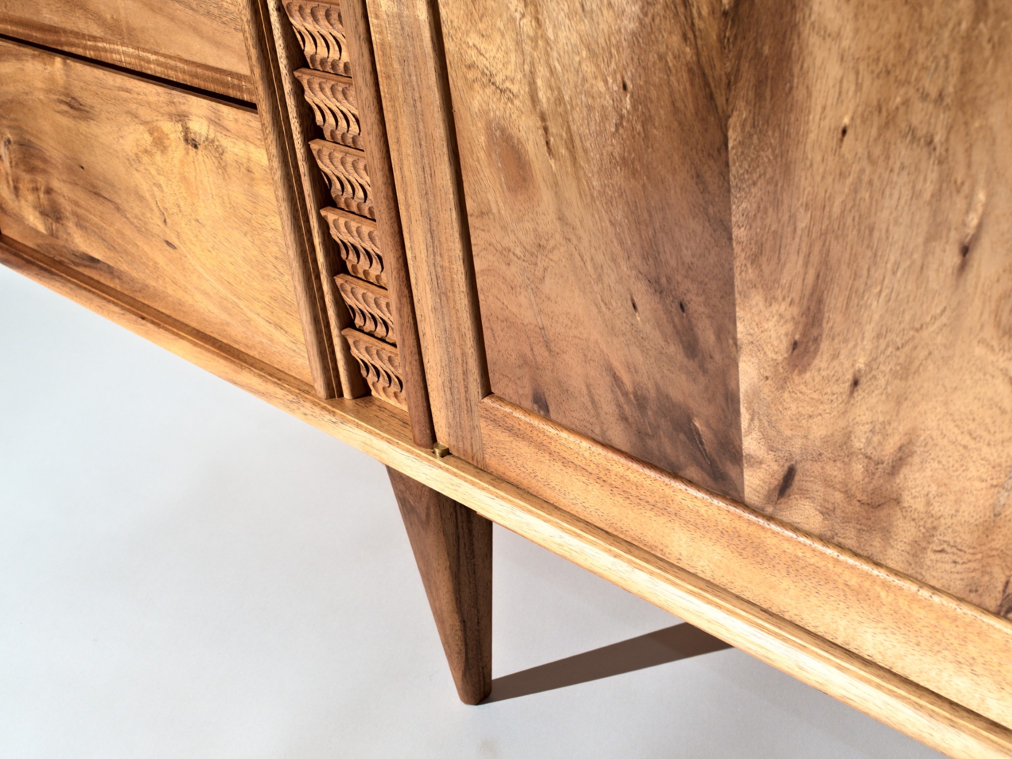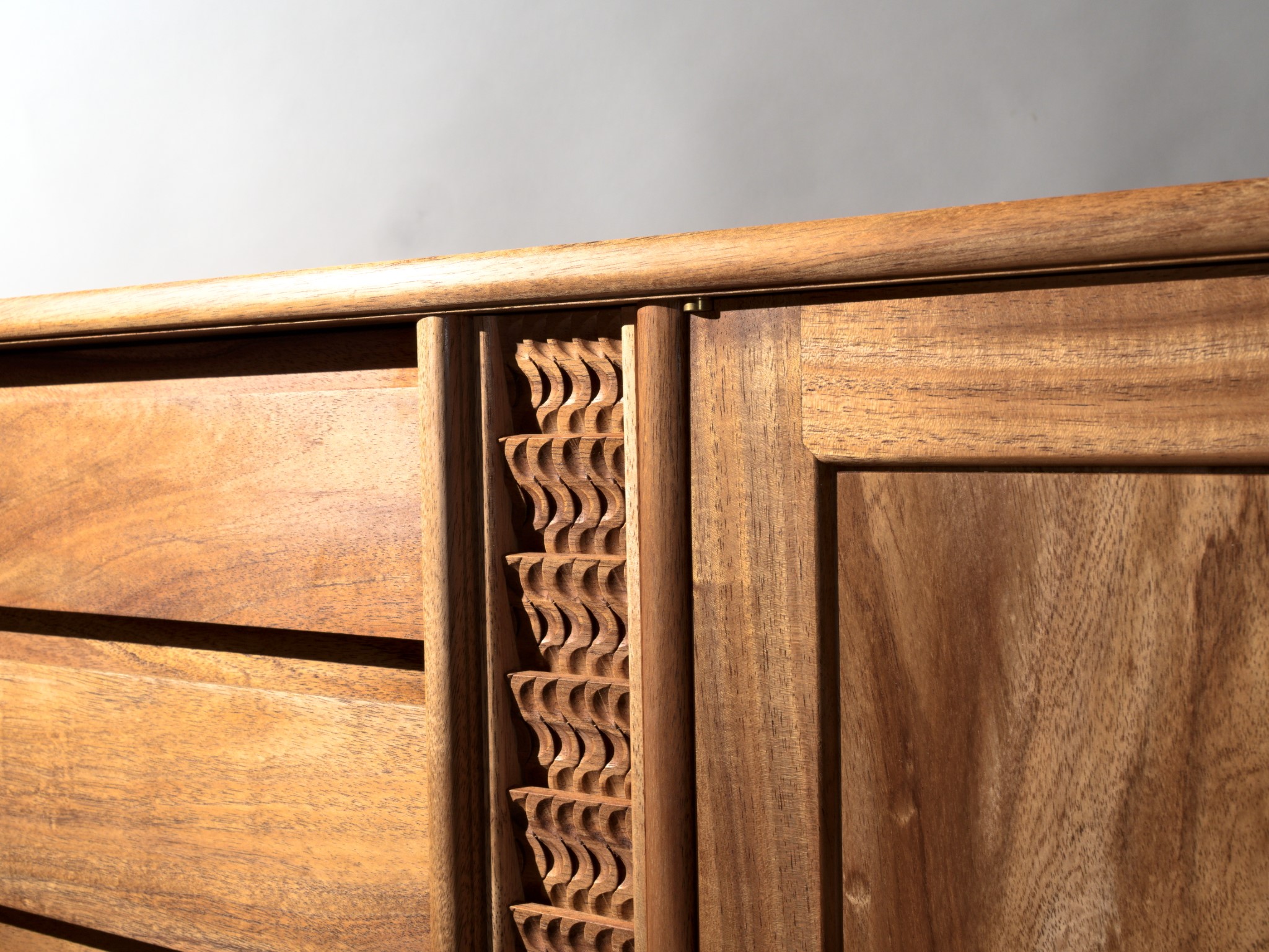 The carved details are made using a single gouge and are inspired by the rhythm of falling water.