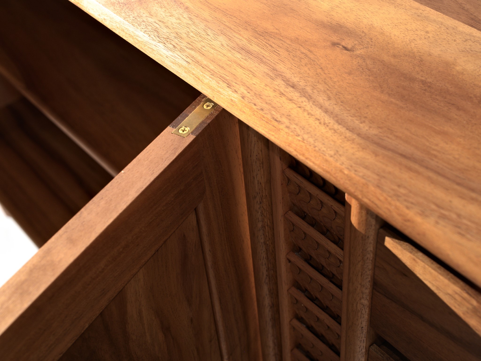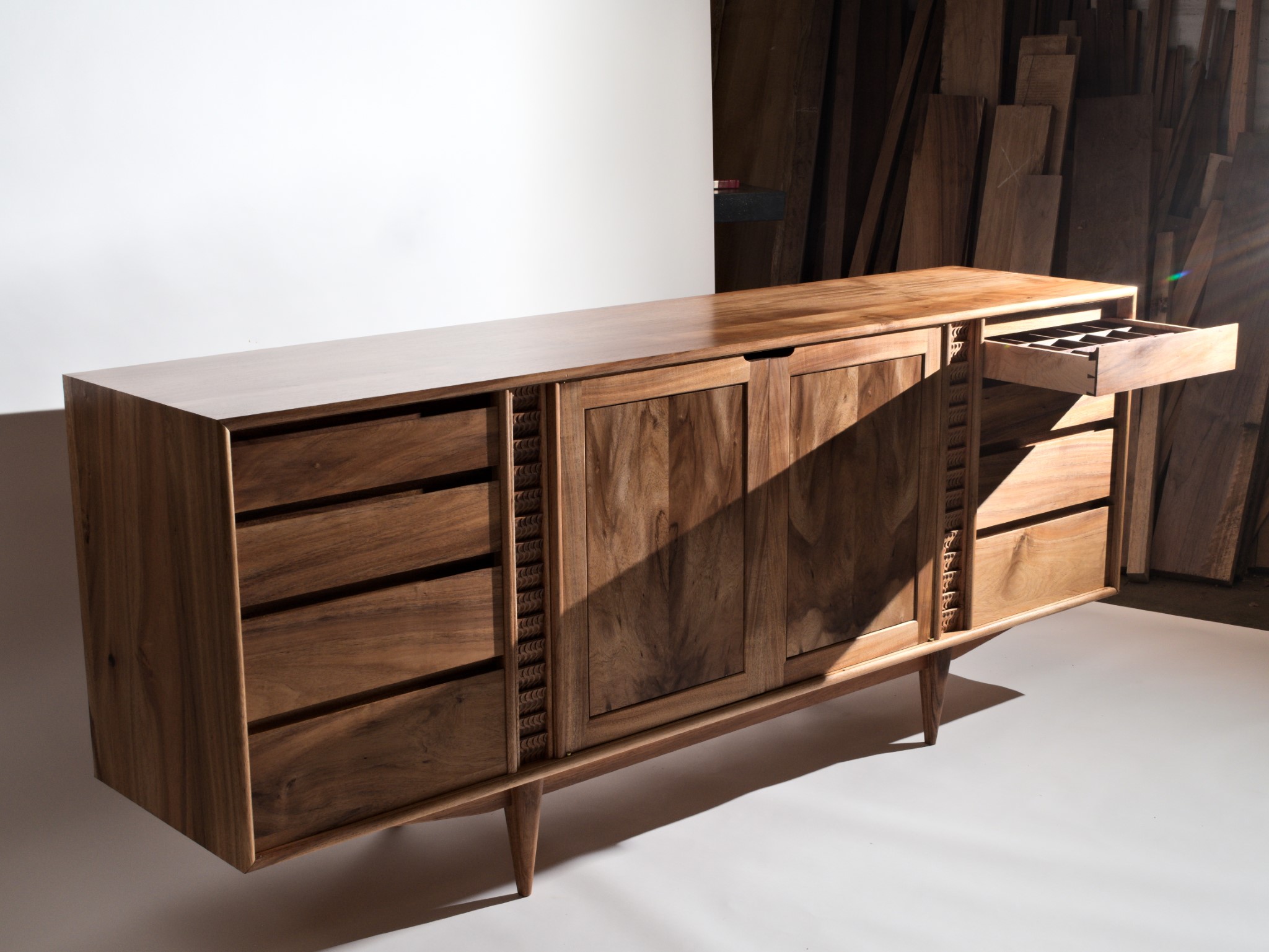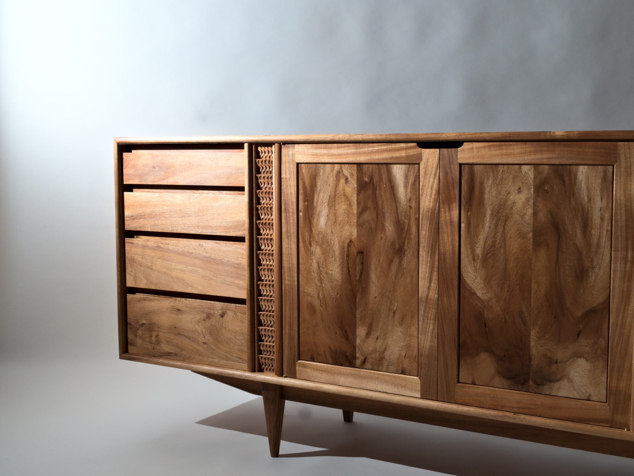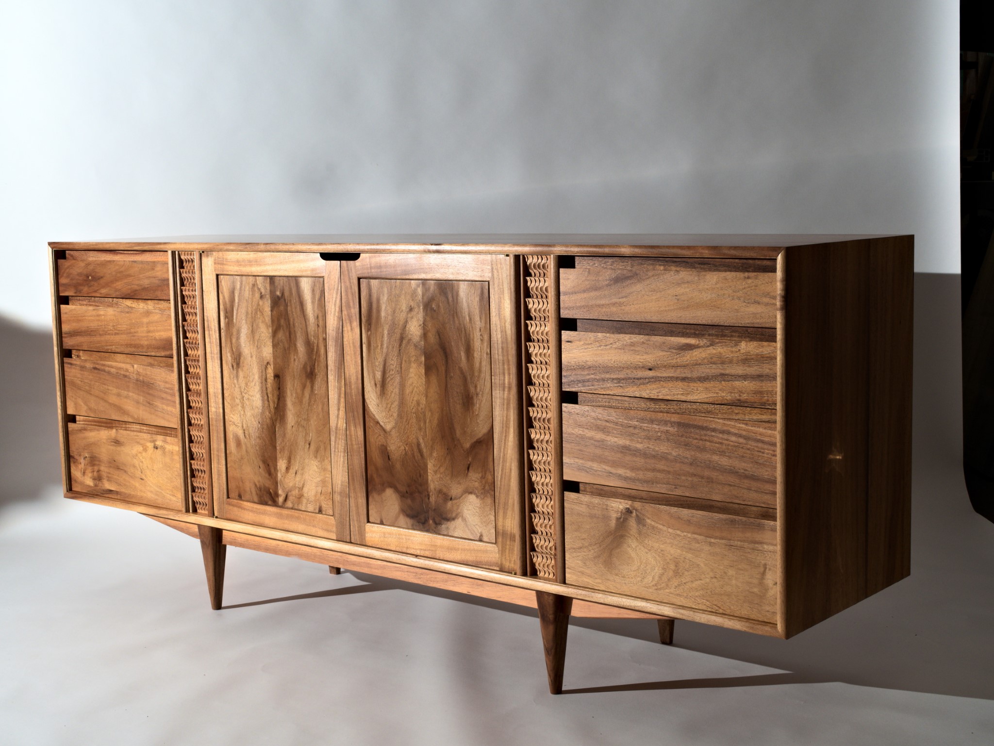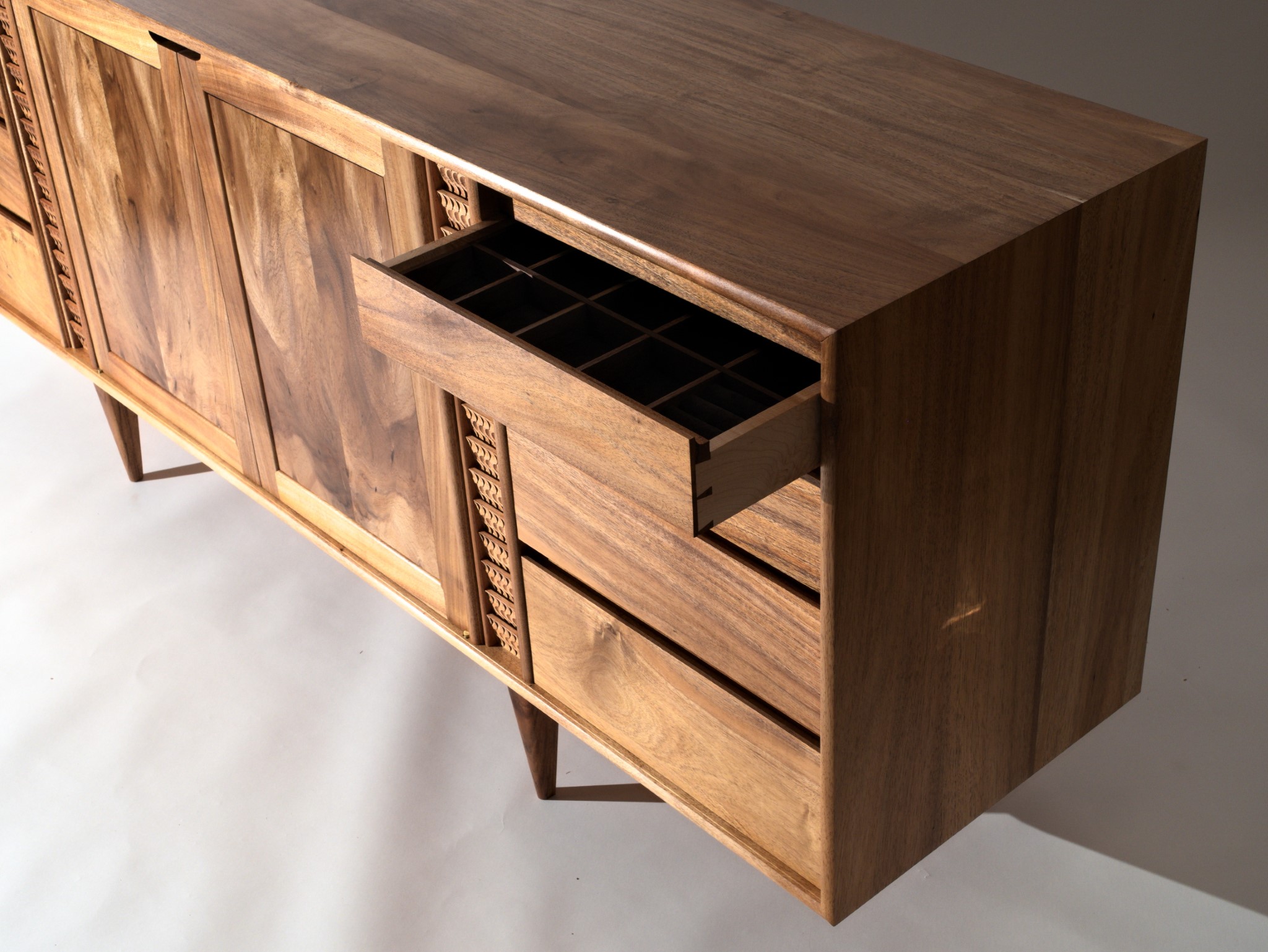 The carved details are made using a single gouge and are inspired by the rhythm of falling water.